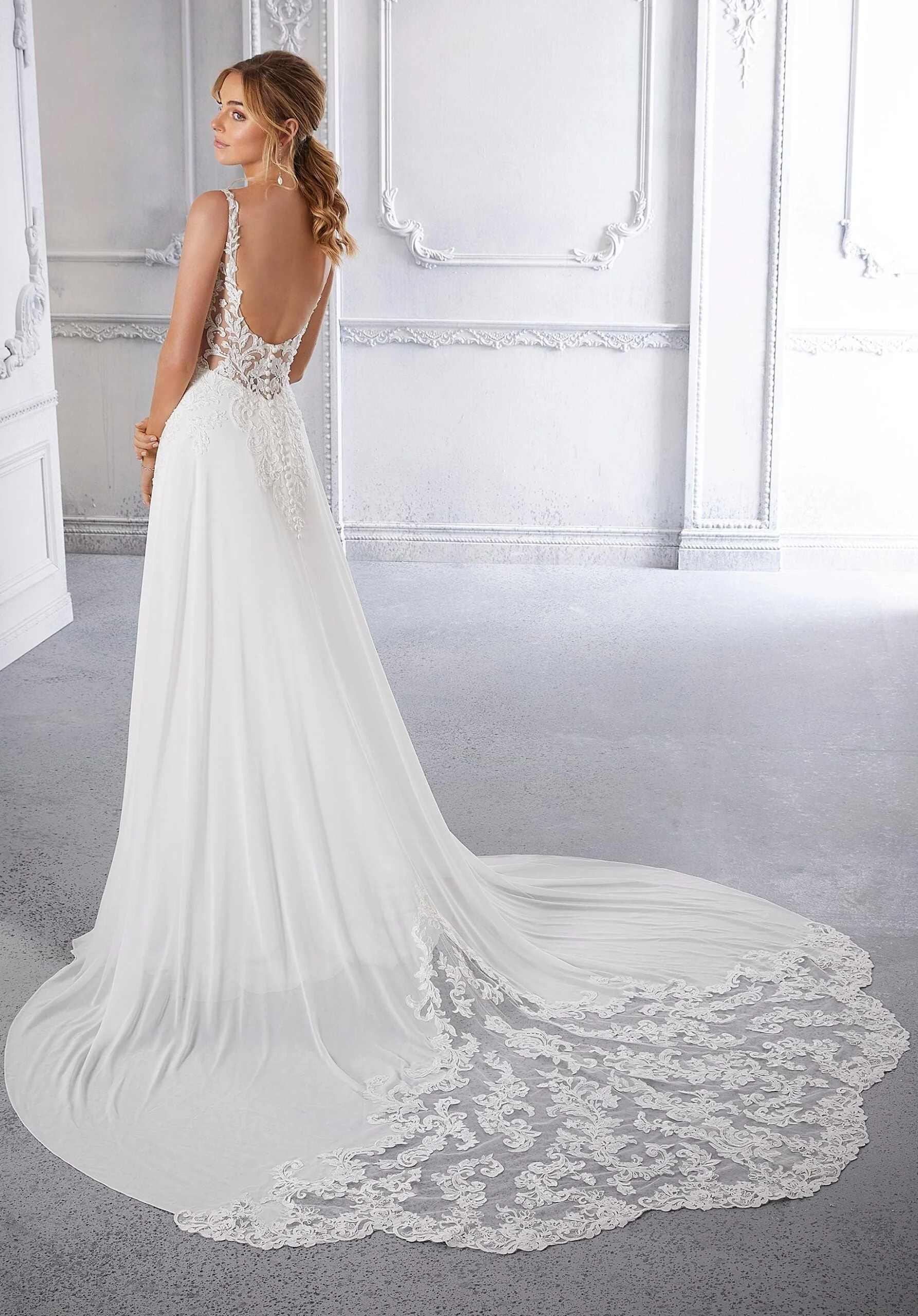 Effortlessly elegant, Caroline brings on the beauty with its pearl and crystal beaded, embroidered bodice. The simple A-line Chiffon skirt cascades down the body to a lovely cut-away lace train, and we can't forget the beautiful scoop back accented by swirling embroidery on sheer net. Shown in Ivory/Honey. Styled with Angel Train Style 11351, sold separately. Available with matching front bodice lining, sold separately as Style 2367LB.