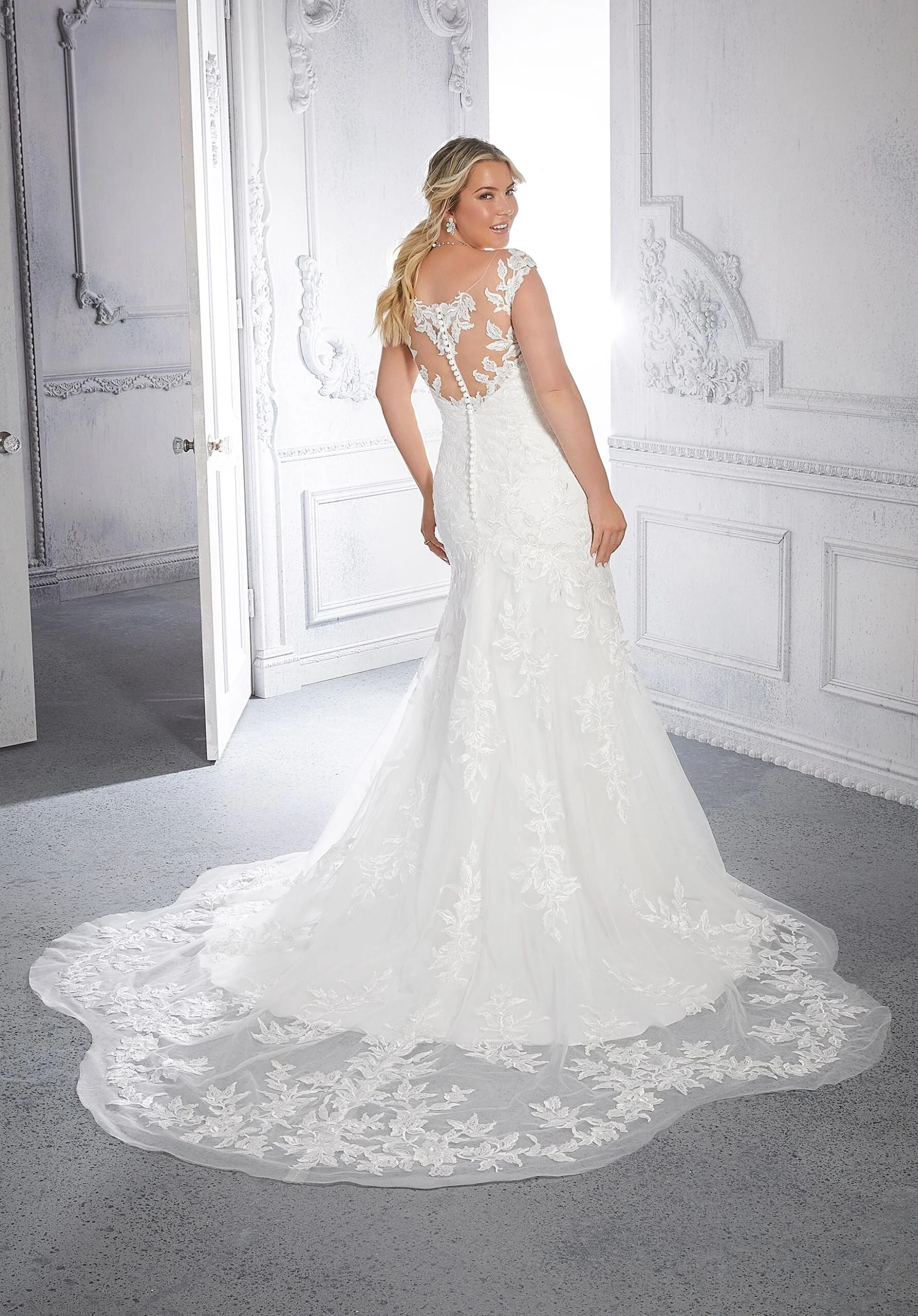 Cathy is the total package with her sultry fit and flare silhouette and gorgeous frosted, embroidered appliqués. The sheer, off-the-shoulder neckline gives way to a beautiful illusion back, lined with dainty covered buttons. An ethereal, sheer petal train completes this darling dress. Shown in Ivory/Honey. Available in three lengths: 55", 58", 61".