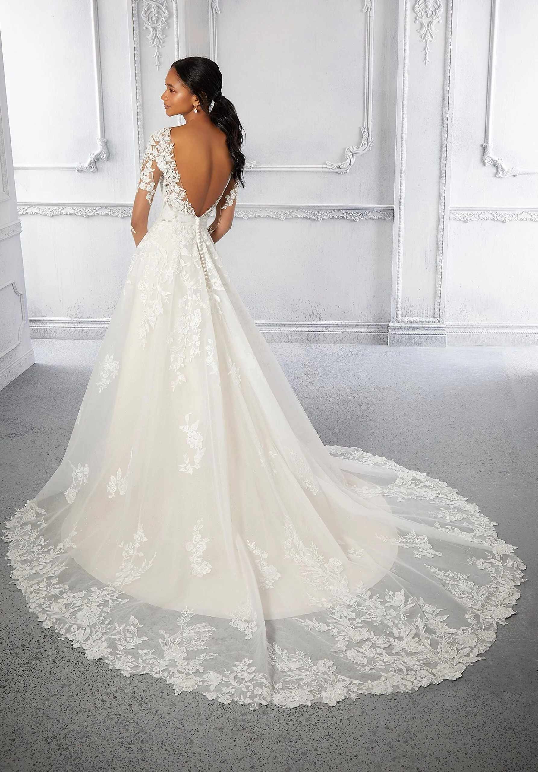 Our Chelsea designer wedding dress is a classic in the making with gorgeous beaded, frosted embroidered appliqués decorating the gown from its sheer long sleeves to scalloped hemline. The soft v-neckline matches the open v-shaped back, while detachable, draped fabric cinches in the waist to create a stunning silhouette. And we didn't forget the sparkle with the glitter net ball gown skirt. Shown in Ivory/Champagne/Honey. Available in three lengths: 55", 58", 61".