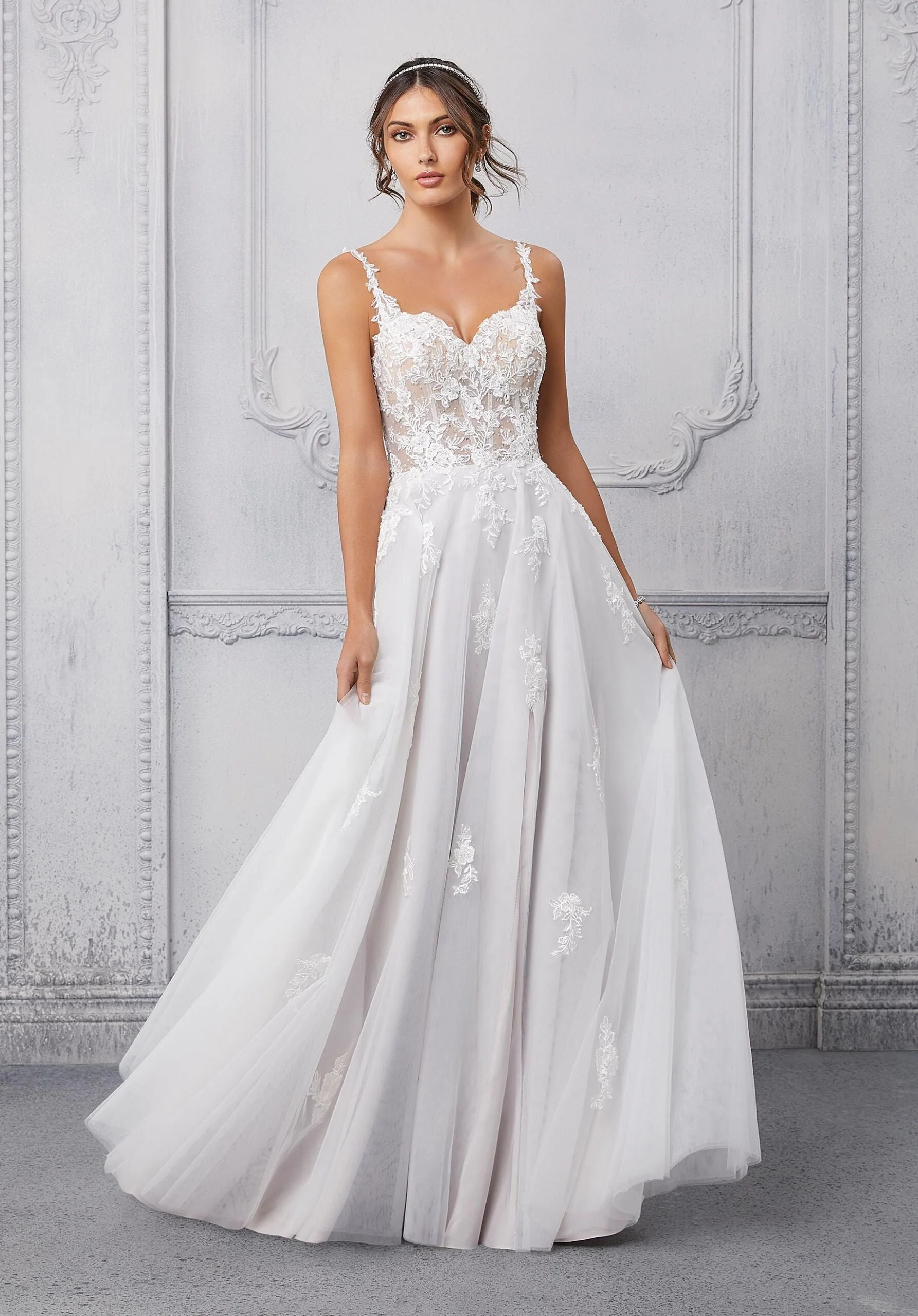 Pretty as a picture, our Cipriana designer wedding dress features elegant pearl and crystal beaded, frosted, embroidered appliqués cascading down from a sheer, boned bodice. The effortless A-line has a soft tulle skirt that creates beautiful movement and a daring front slit for a pop of leg. Completed with breathtaking details, like the open back and sheer train, with lace edging, this gown is a certified bridal beauty. Matching front bodice lining available and sold separately as Style 5915LB. Shown in Ivory/Champagne/Honey and Ivory/Smoky/Lavender/Honey.
