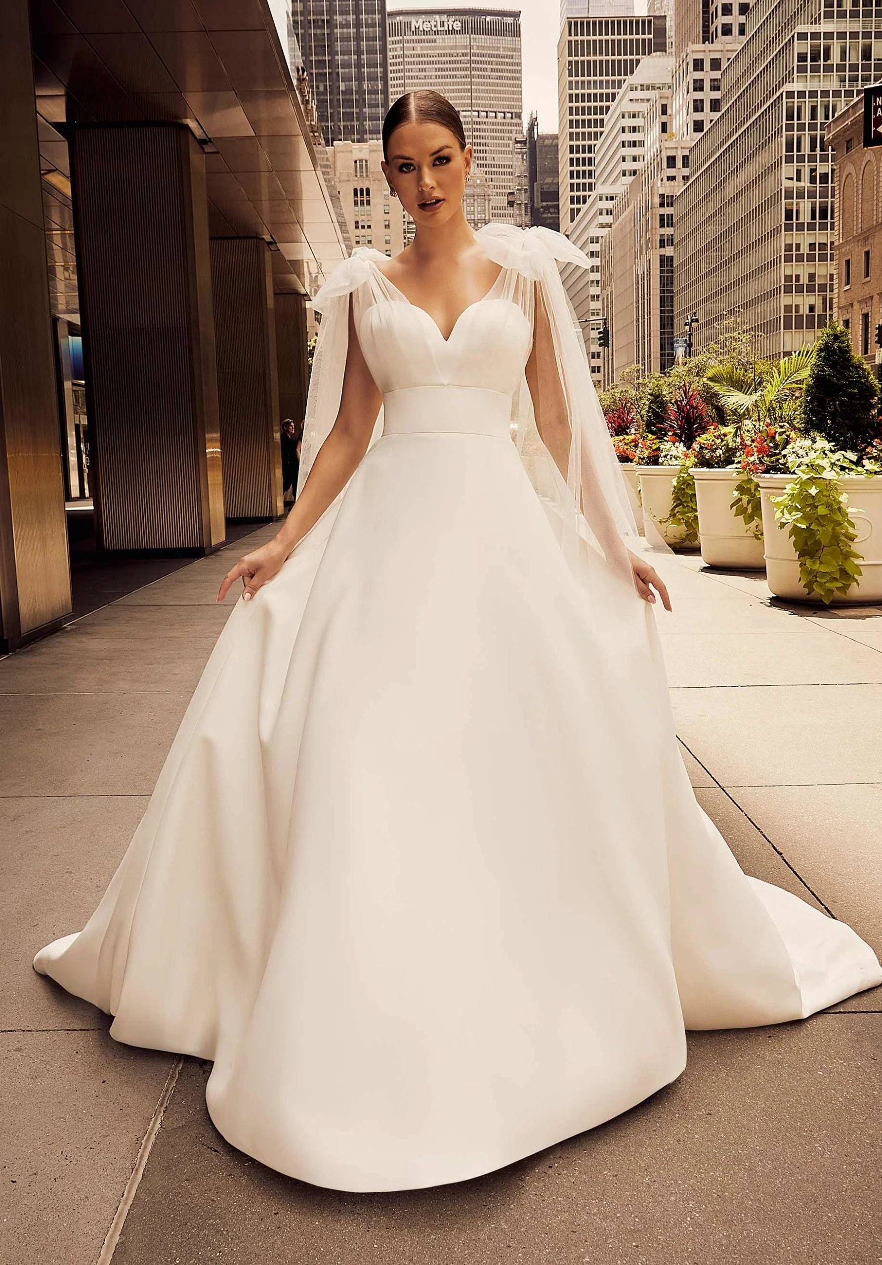 Our Joelle designer wedding dress is a modern fairytale. The billowing ball gown looks radiant in sleek satin with classic elements like the sweetheart neckline and covered buttons down to the hem. Draped tulle accents the banded bodice to form tie-bow sleeves that float around you for a whimsical touch. Shown in Ivory.