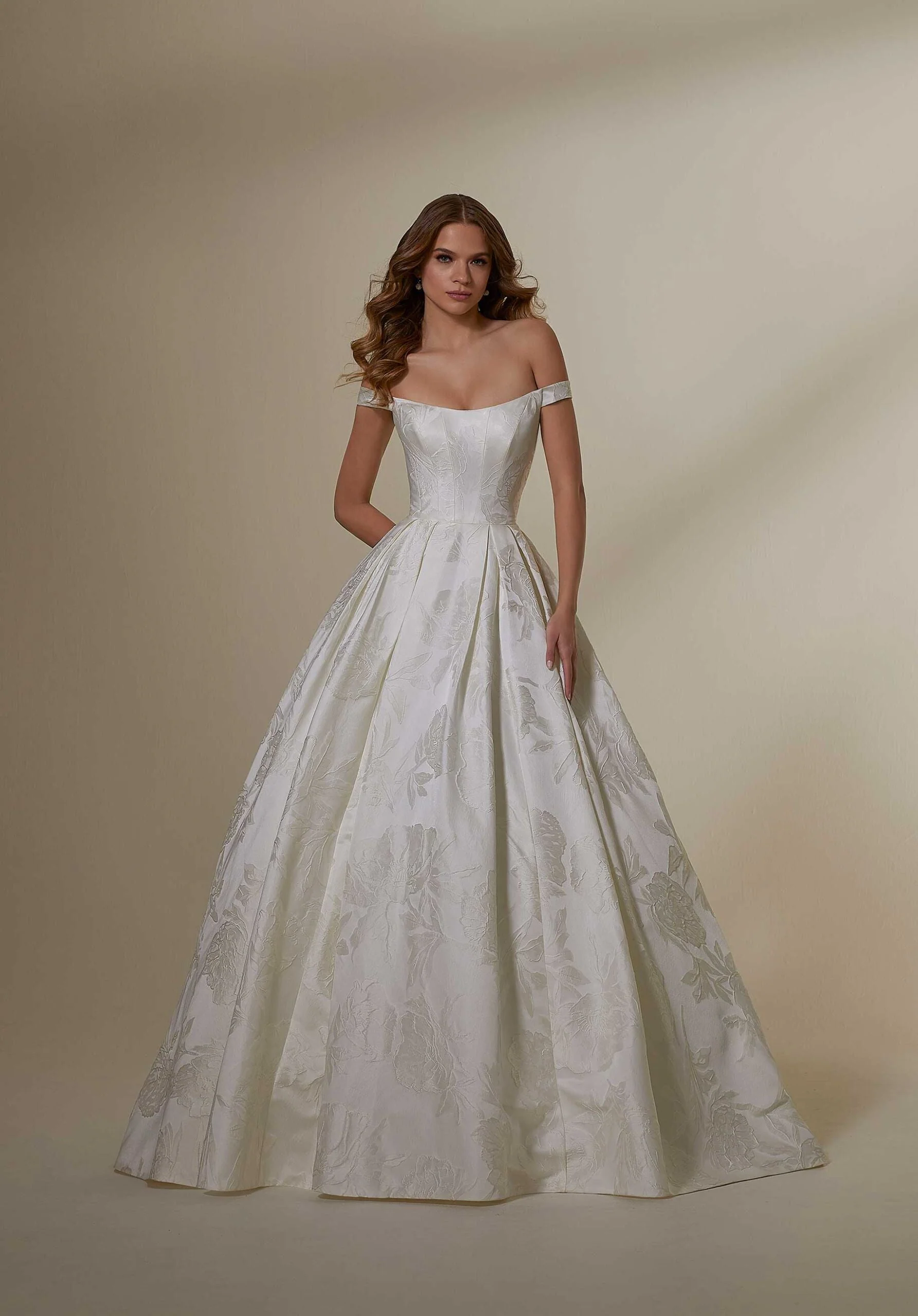 Our Marquesa designer wedding dress is all about decadent design. The beautiful brocade ball gown feels unique with its textured floral pattern and off-the-shoulder bodice featuring contoured seaming. The pleated skirt and buttons to the hem are a classic touch that makes this dress a timeless choice. Shown in Ivory. Available in Mikado as Style 2547M