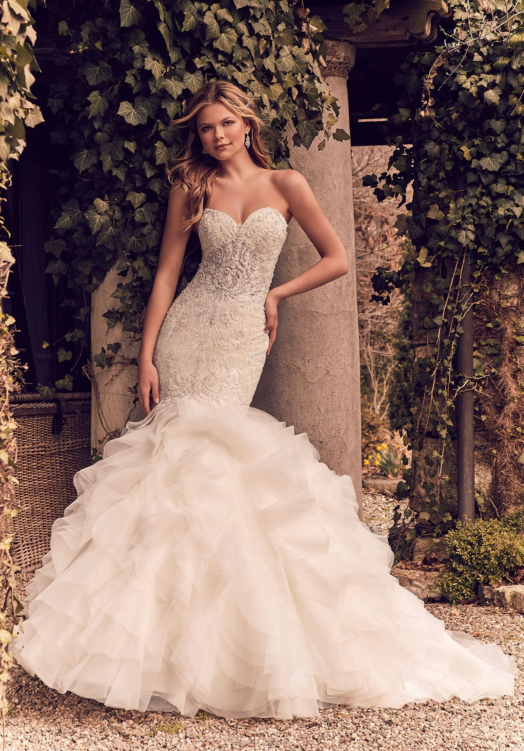 This strapless Muse designer wedding dress is accented by a romantic sweetheart neckline. This wedding dress features sculptured, embroidered appliquès with crystal beading on hand-cut, cascading organza. Available in white, ivory, and champagne, this bridal gown is highlighted by a mermaid silhouette. This wedding dress is available in three Lengths: 55'', 58'', 61''. The matching satin bodice lining is included. Shown with headpiece style HP2021. Shown in ivory/champagne.
