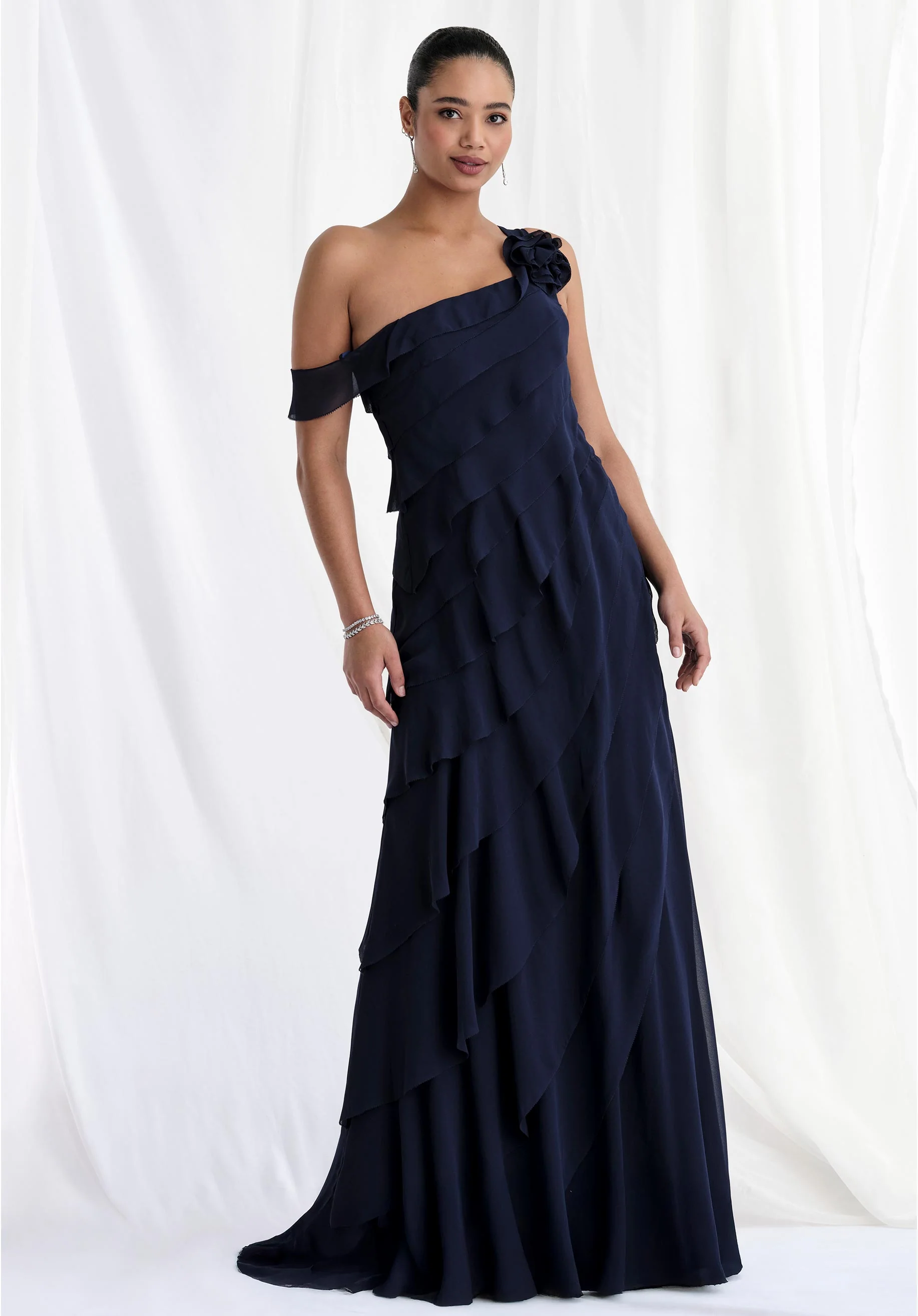 Romantic layers with a sculptural twist, this modified fit and flare evening gown features a one-shoulder silhouette adorned with a delicate rosette detail. Tiered chiffon cascades gracefully, creating soft movement and timeless elegance.